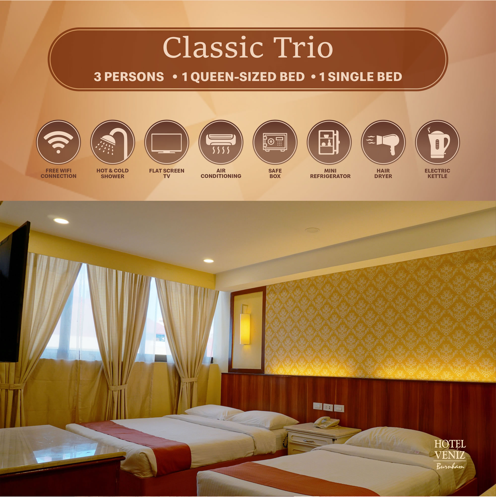 Have a relaxing sleep with our Classic Trio Room, more spacious compared to other trio rooms with a queen-sized bed and a single bed.