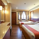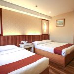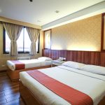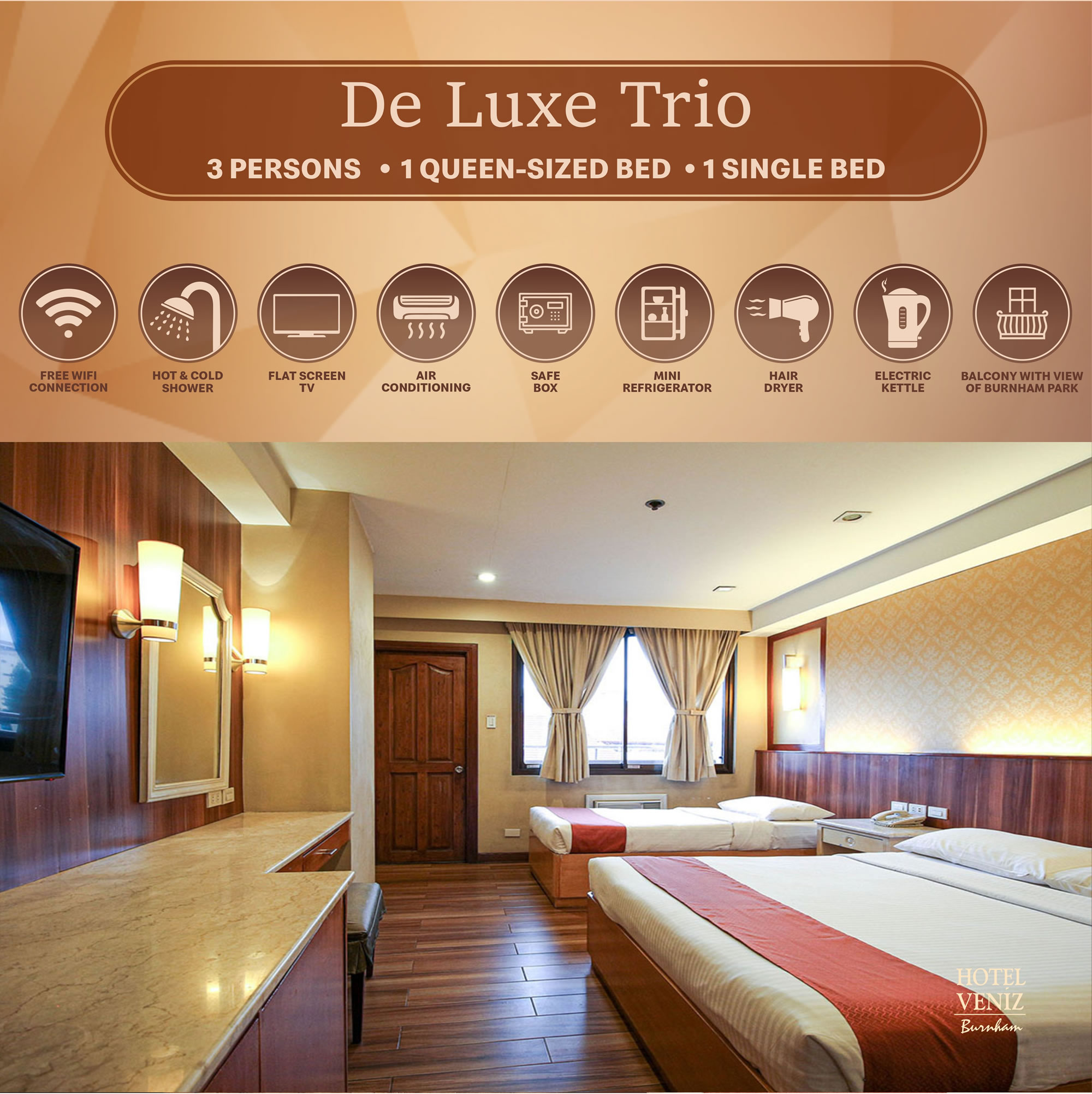 The Deluxe Trio Room has a queen-size bed and a single bed with a balcony overlooking the city.