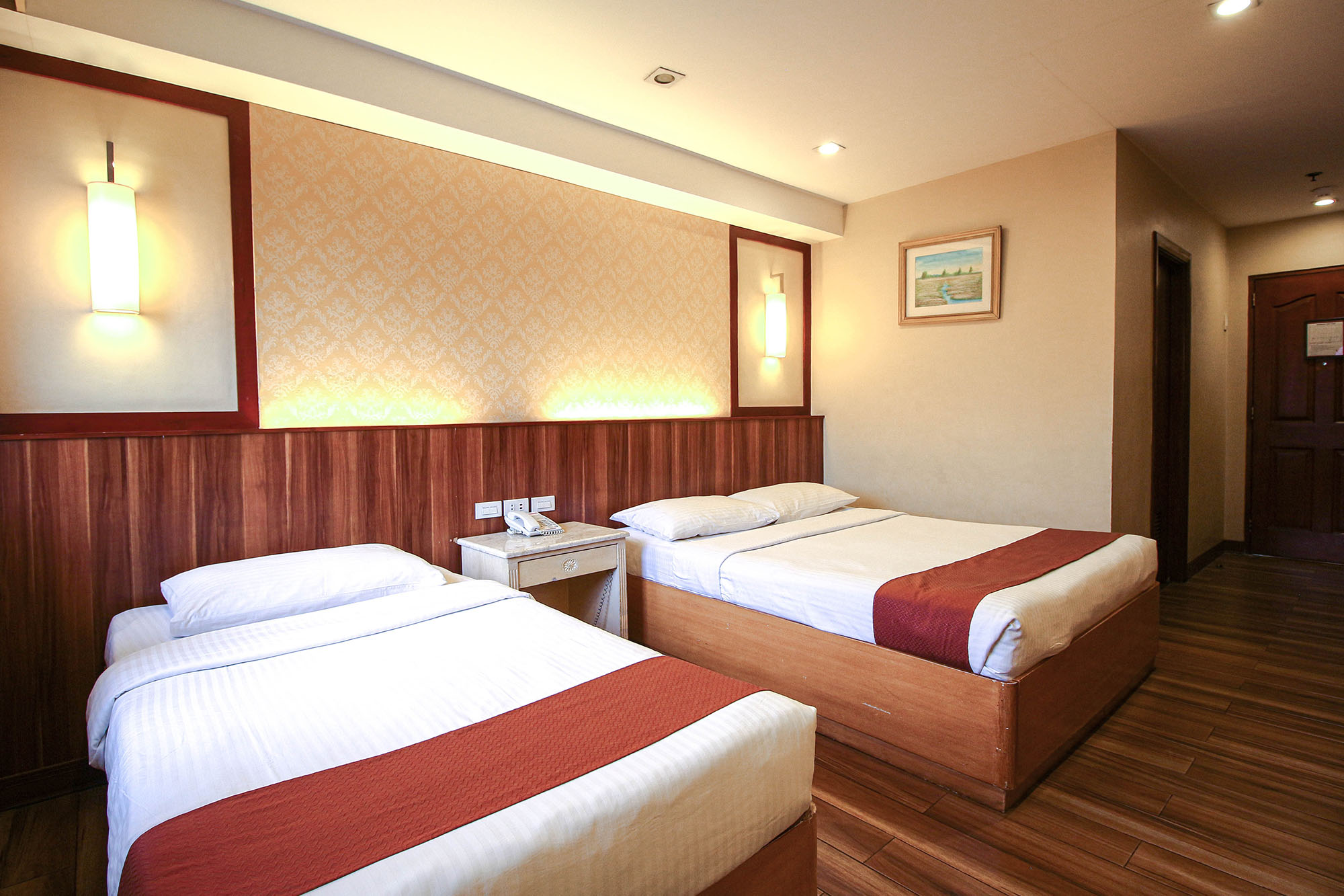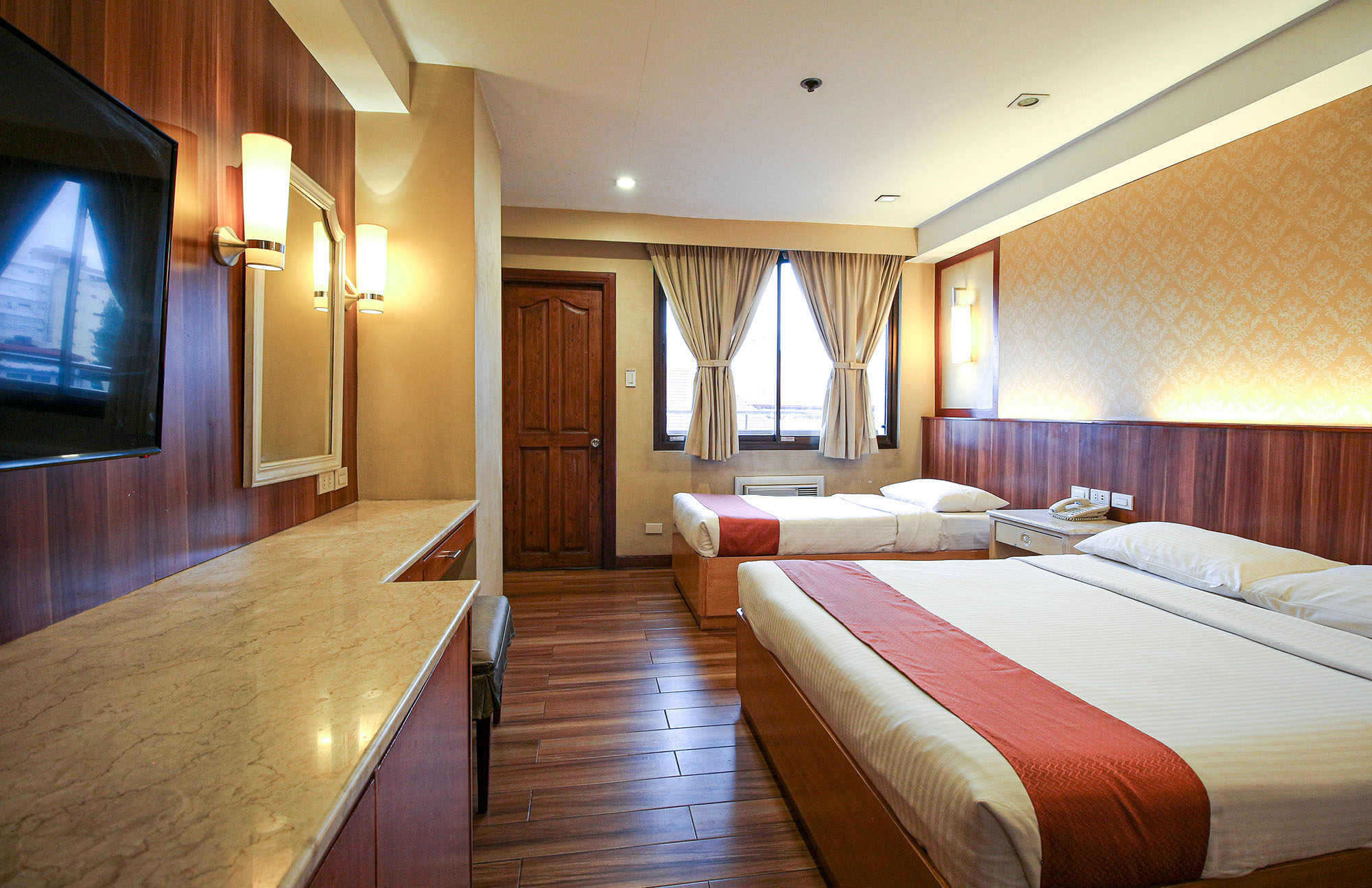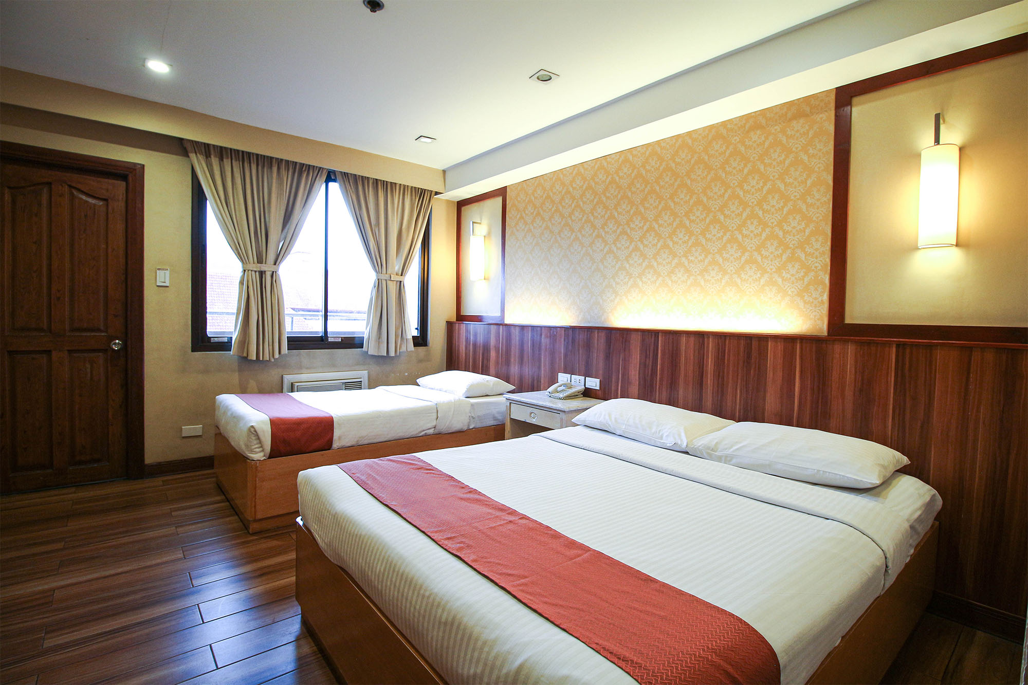 The Deluxe Trio Room has a queen-size bed and a single bed with a balcony overlooking the city.