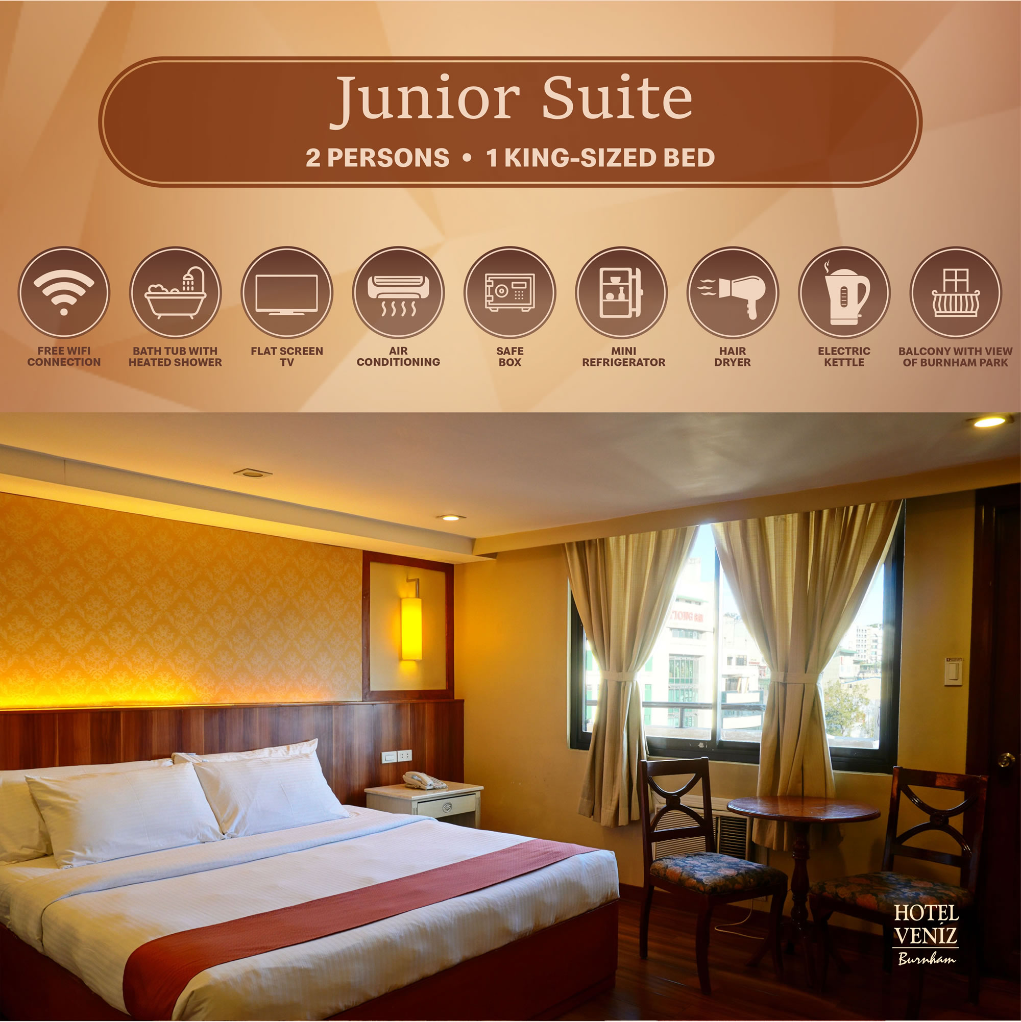The Junior Suite Room has a king-sized bed and a bath tub. It has a veranda with the view of the city and Burnham park.