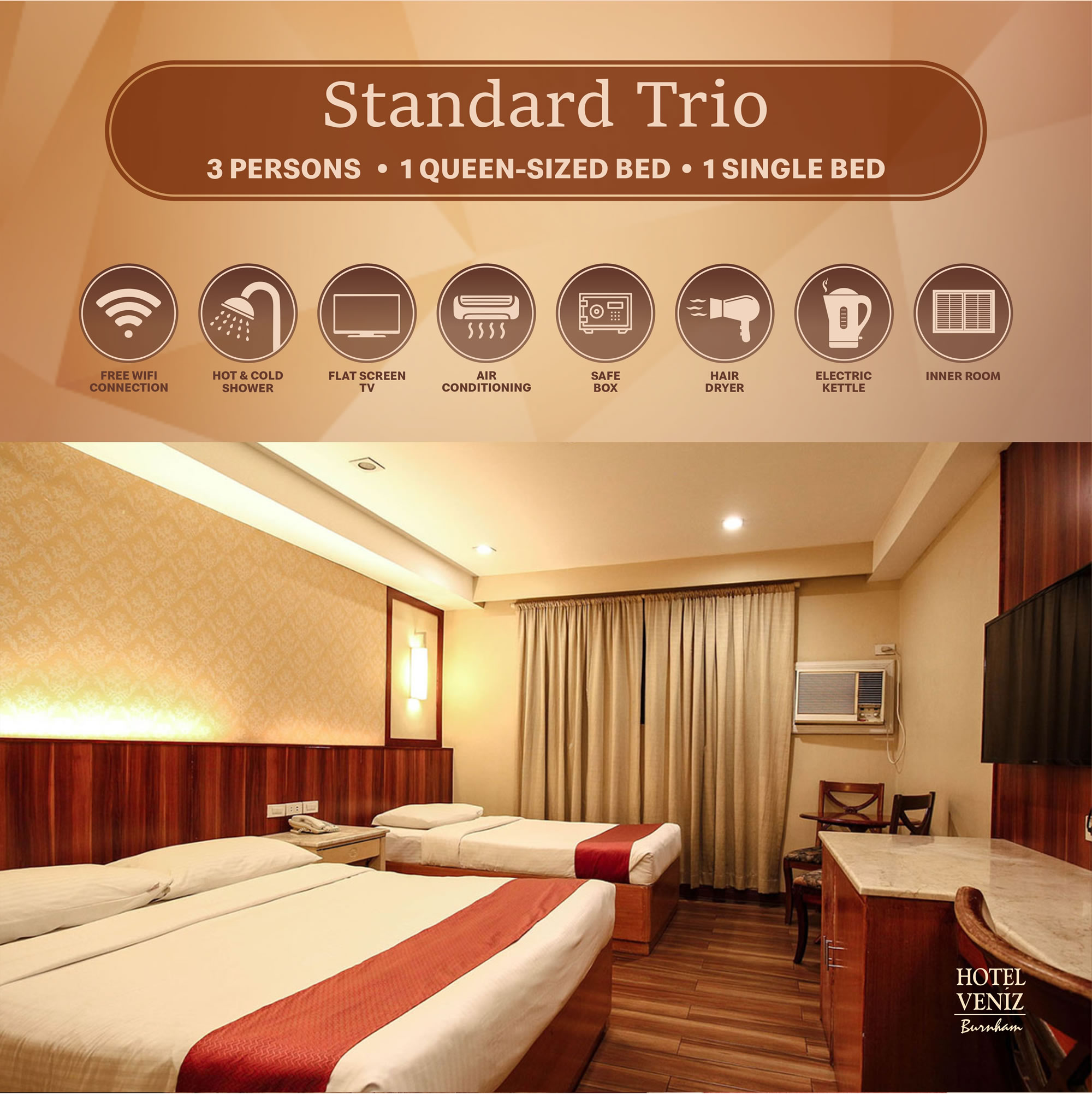 Have a relaxing sleep with our Standard Trio Room with a queen-sized bed and a single bed with a private bath complete with amenities. No window.