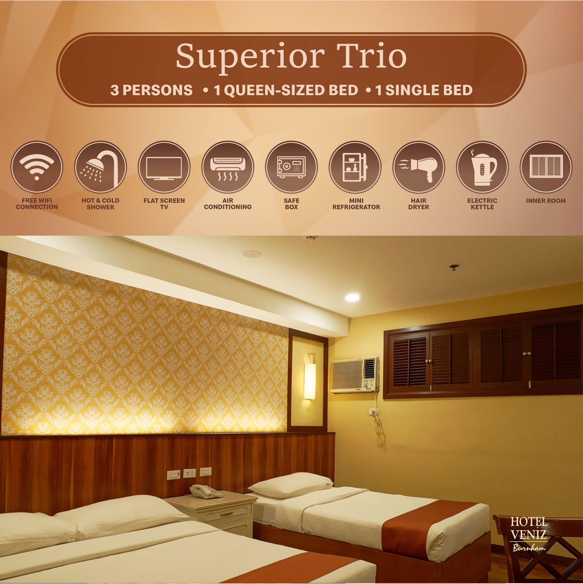 Have a relaxing sleep with our Superior Trio Room with a queen-sized bed and a single bed with a private bath complete with amenities.